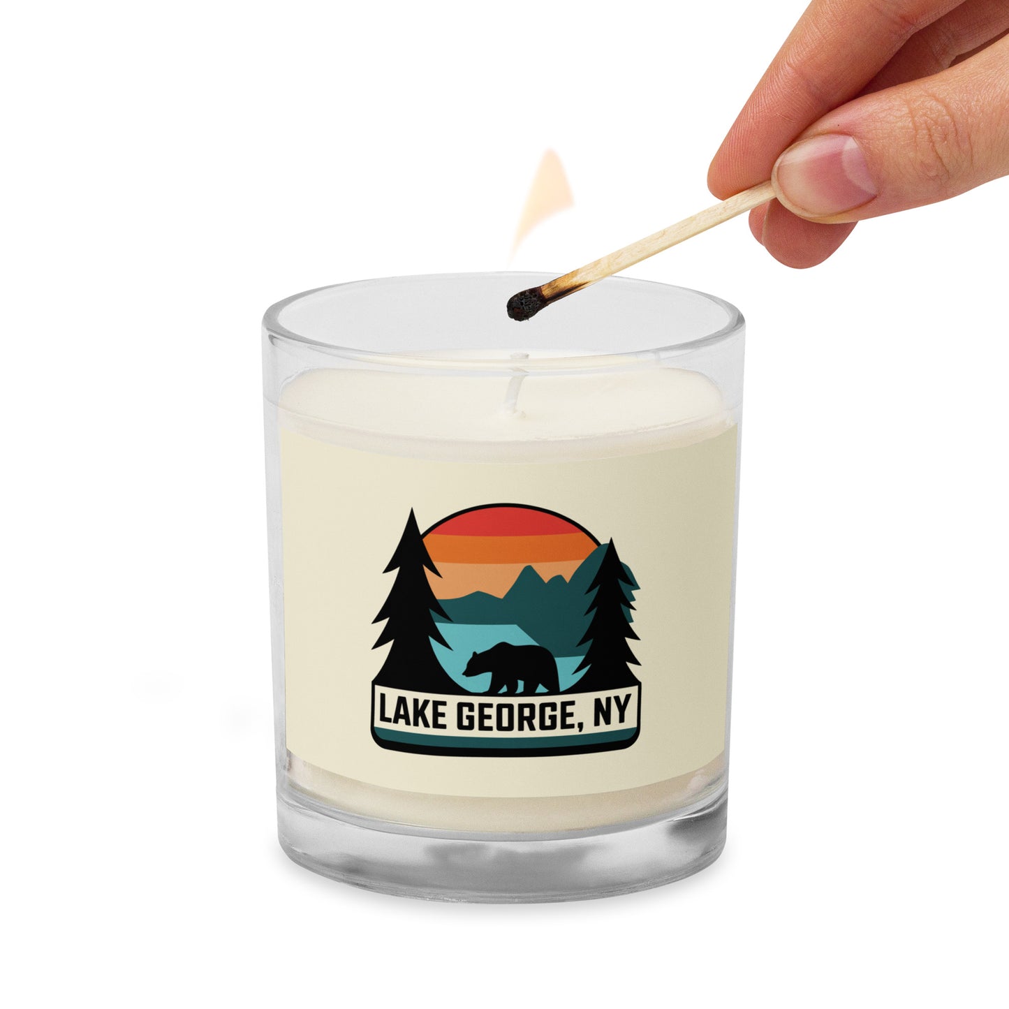 Capture the essence of Lake George with this beautifully crafted candle, featuring a minimalist design that showcases the tranquil lake, majestic mountains, and a roaming bear in the background.